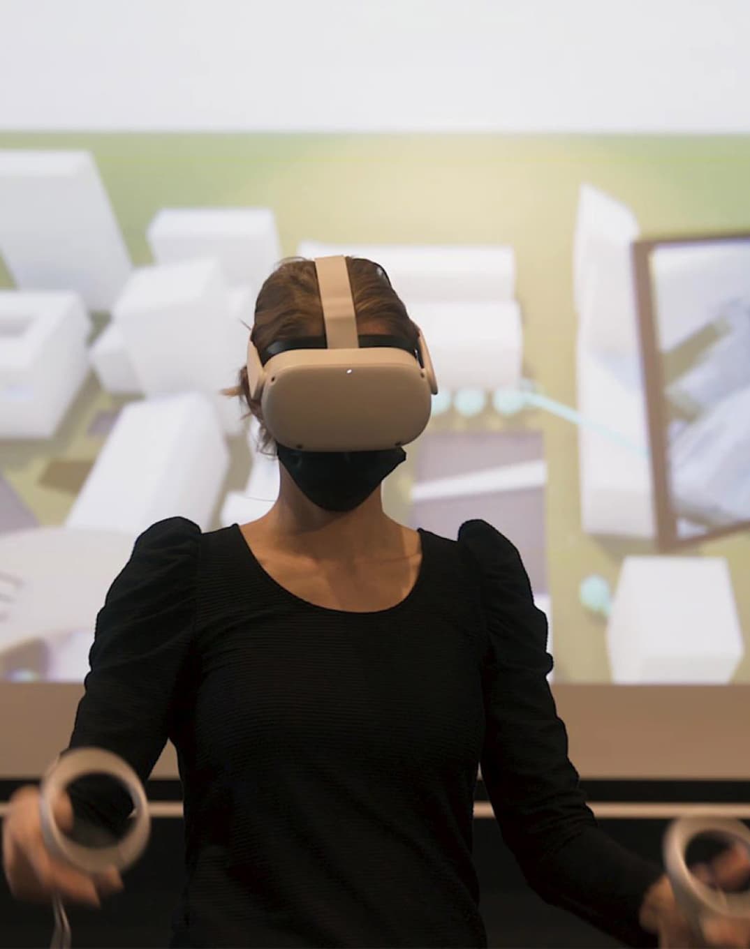 We thought also about a completely new feature that was bringing the user experience to a complete new level. The Oculus Quest headset has a feature called pass-through camera. This is a low resolution black and white camera which is primarily used to help the user initially set up a safe zone and spatial barrier in which to move around. As you are completely blind while wearing a VR headset, pass-through is a way to connect to the real world. We decided to use this feature to introduce a completely new concept of passthrough modelling.