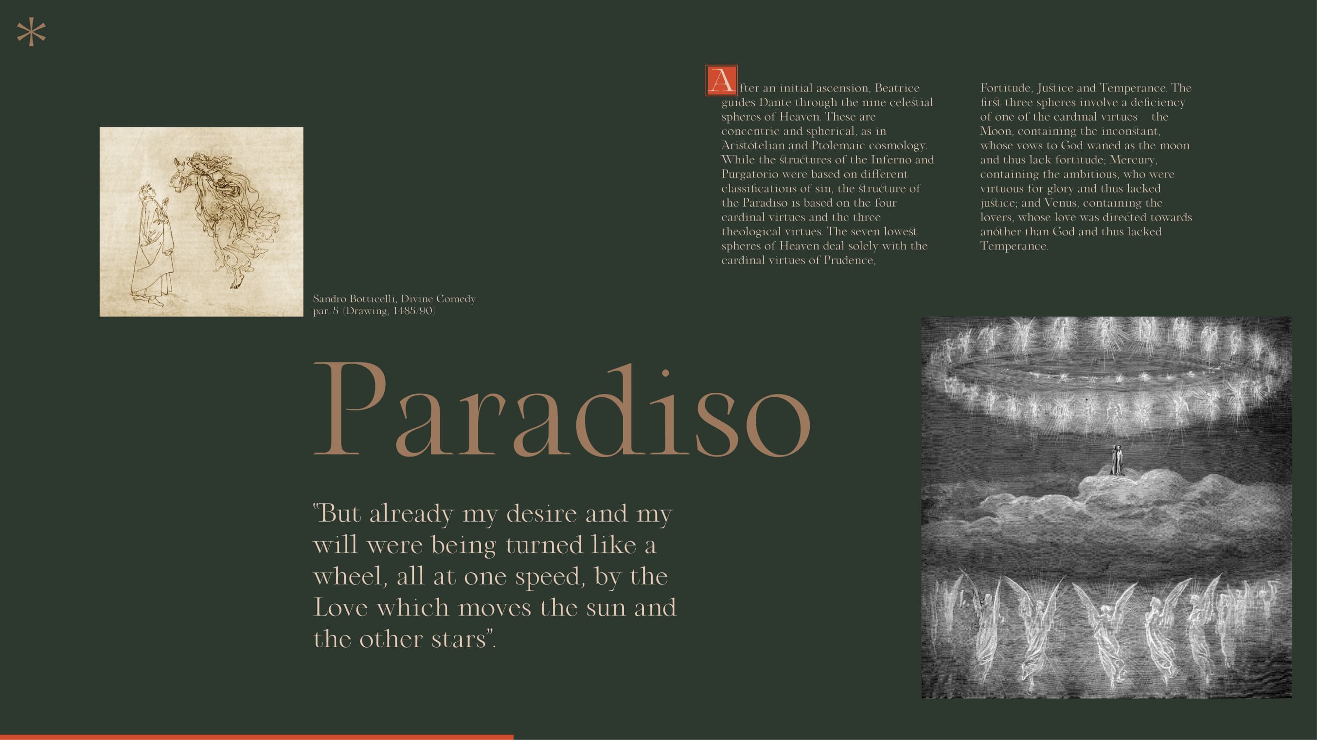 The layout is divided into four main sections where we focus on each book of the poem. The Hell, the Purgatory and the Paradise. An introduction page was created to introduce the project and the overall details of the three books. A particular effort has been made on the design in order to highlight all the illustrations and images. To follow this path we tried to give full height to most images.